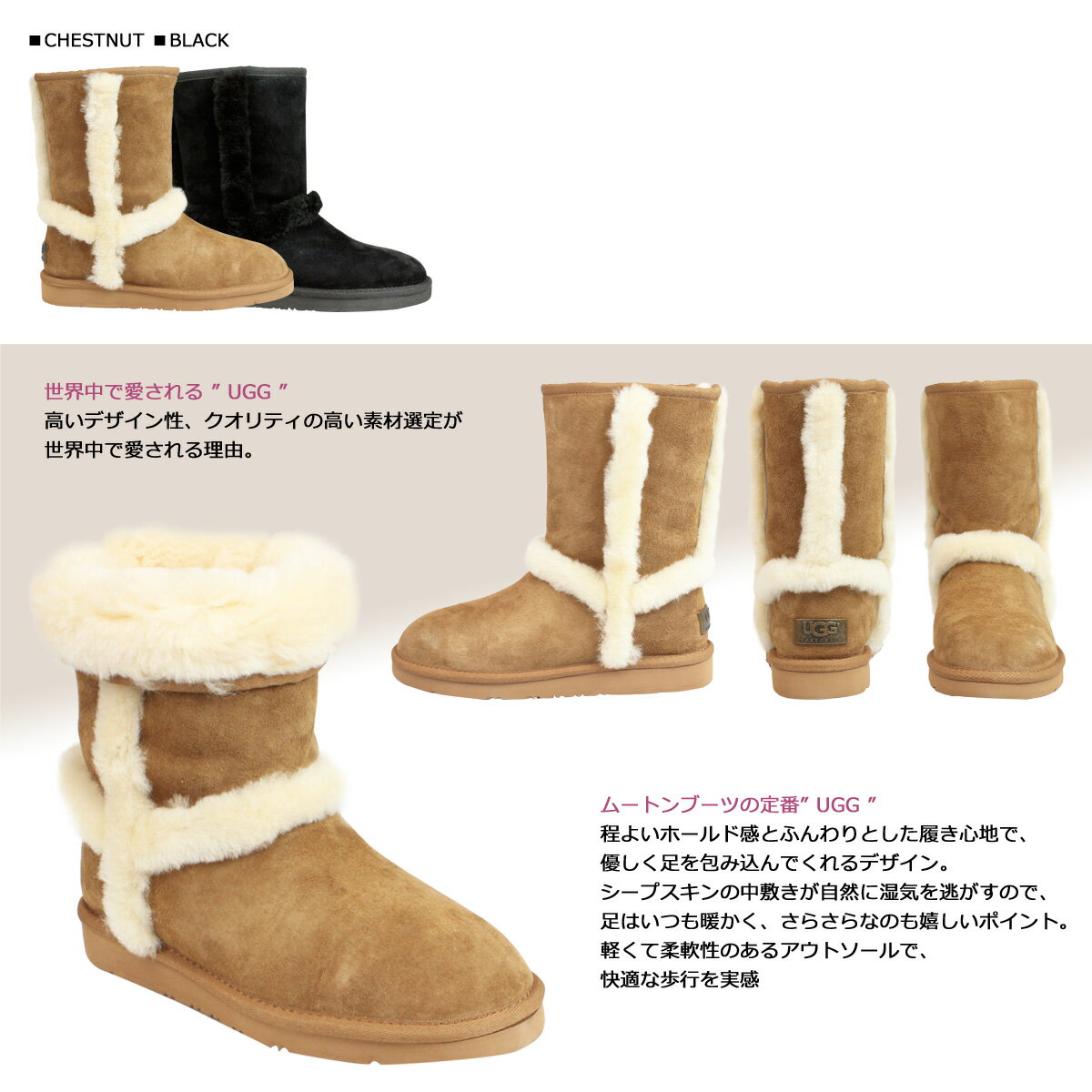 ご不安な場合は市販の防水キットをご利用ください ブランド名 / 商品名 UGG アグ / CARTER TL 1005803 カラー CHESNUT BLACK 素材 アッパー:天然皮革 シープスキン、レザー サイズ US5(約22.0cm) US6(約23.0cm) US7(約24.0cm) US8(約25.0cm) US9(約26.0cm) US10(約27.0cm) ご購入前に必ずお読みください 靴のサイズについて 基本的にはブランドのオフィシャルチャート、または箱に記載されているサイズをもとに記載させていただいております。