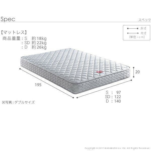 【仕様】 張地:ポリエステル44%、綿28%、レーヨン28% 中身:樹脂綿、ウレタンフォーム、フェルト、パームパッド コイル:高密度連続スプリング 【サイズ】 幅97x奥行195x高さ20cm 重量:約18kg (61400430)お届け営業日16時までにご注文・入金確認で1〜3営業日以内に出荷※土、日、祝日は出荷業務をお休みしております。